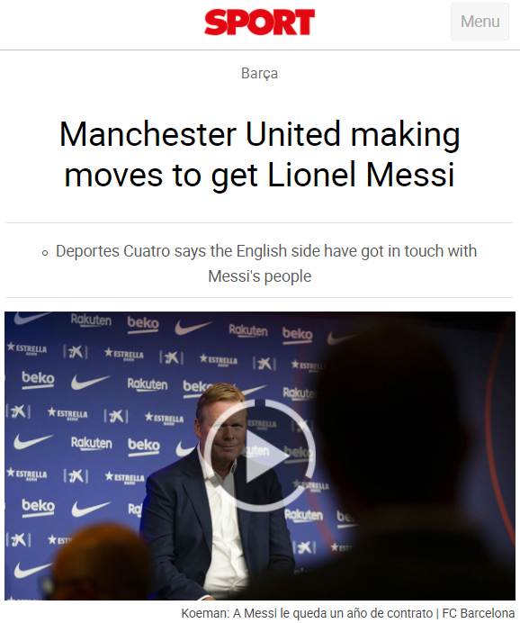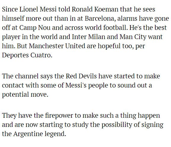 맨유는 메시 측근을 만나며 접촉을 알렸다. 맨유는 메시를 데려올 만한 능력이 있으며 아르헨티나의 전설을 데려오기 위한 연구를 시작했다.
