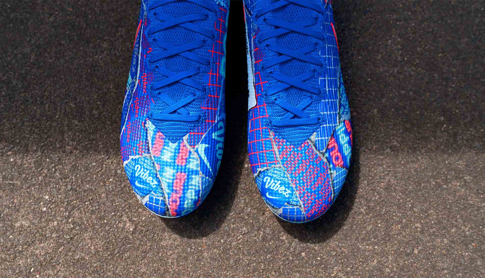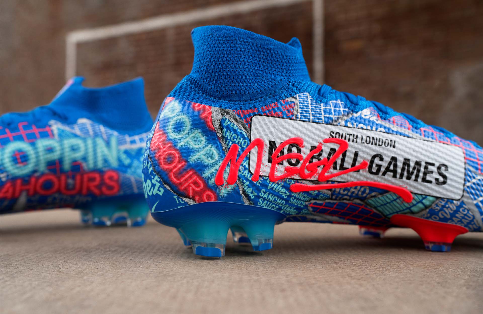 축구화는 굉장히 화려한 디자인으로 제작됐습니다. 축구화 위에는 산초의 플레이 스타일을 표현하는 단어들인 MEGZ(nutmeg), Vibez, Sancho Sauce가 새겨져 있고 산초와 고향인 케닝턴을 연결하는 단어인 Blue Park, #SE11, 4 J@DON 단어가 새겨져 있습니다.