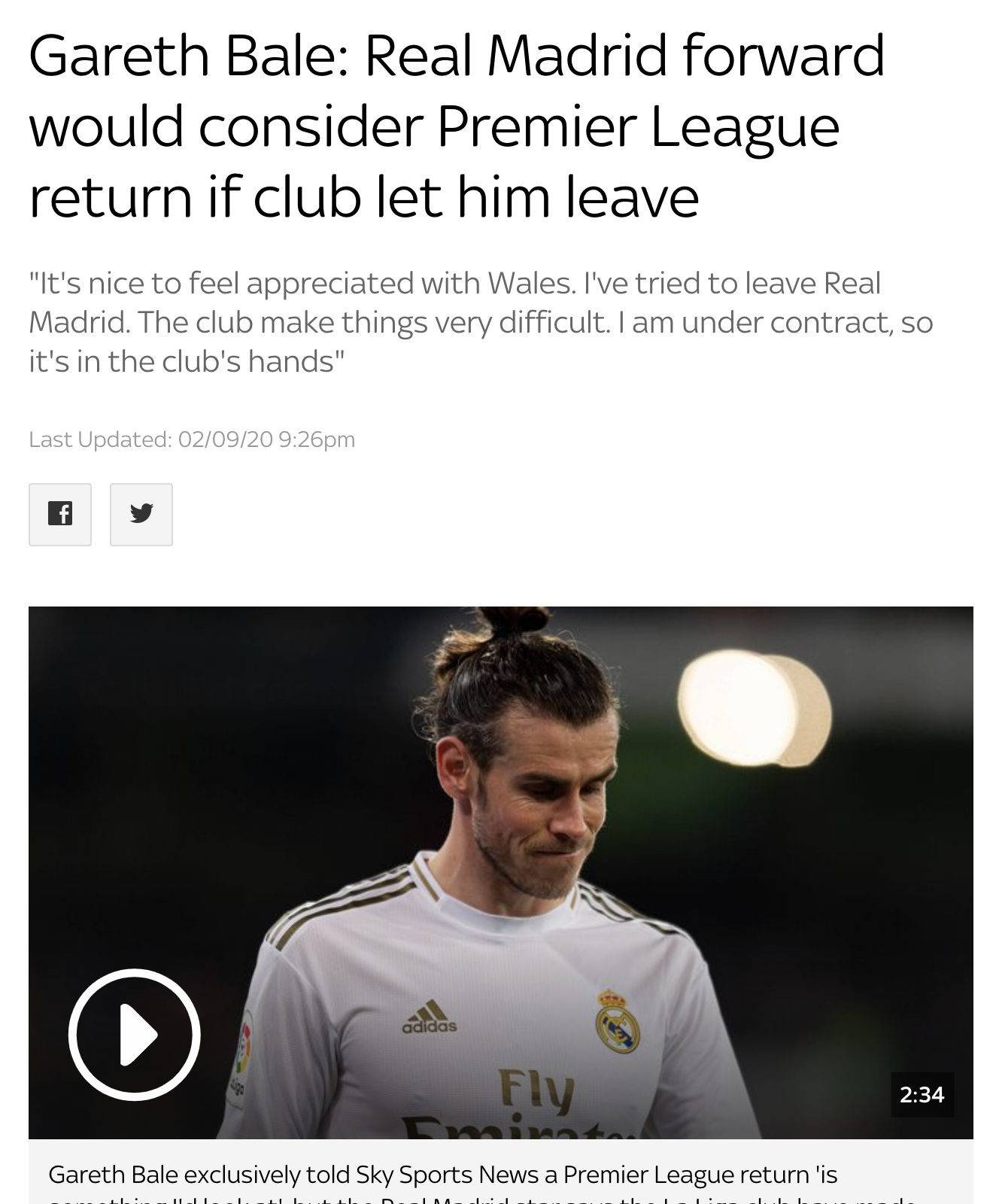 -베일은 이제 축구를 하고 싶다며 레알이 허락만 한다면 PL 복귀를 고려할 것.
