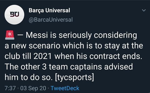 메시는 팀의 잔류를 심각하게 고민하고 있고 가능성은 약 90%라고 함. 바르셀로나 전 주장들 3명이 메시에게 잔류를 권함