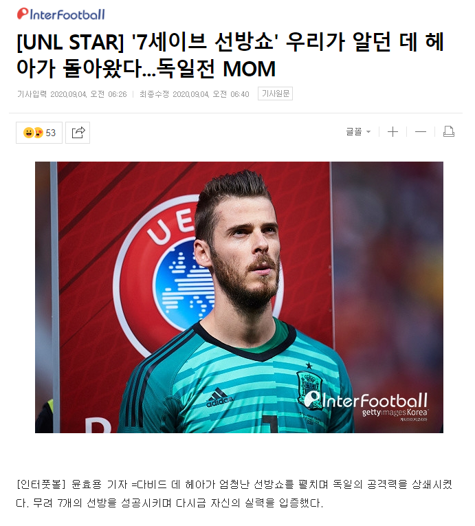 경기 후 축구전문분석매체 '후스코어드닷컴'의 통계에 따르면 데 헤아는 이날만 7선방을 해냈다. 평점도 7.9점을 부여받으며 양 팀 선수 중 가장 높은 평점을 기록하며 MOM(Man Of the Match)으로 선정됐다.