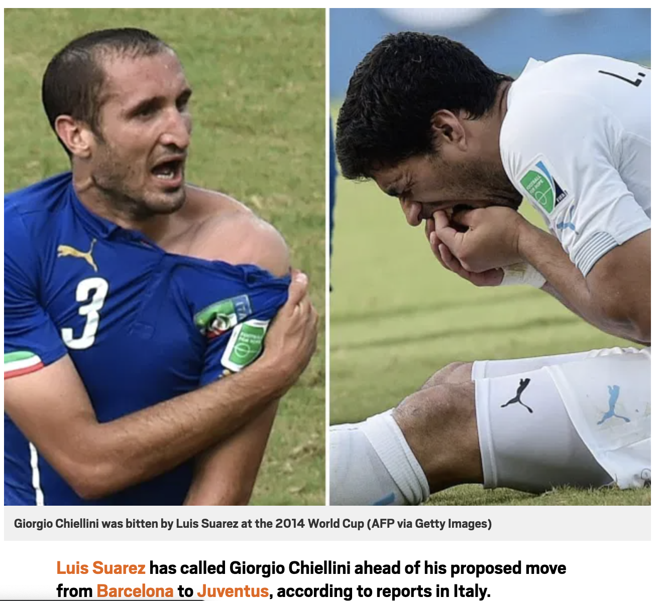 루이스 수아레스는 유벤투스로의 이적을 앞두고 지오르지오 키엘리니와 전화통화를 했다. 키엘리니는 지난 2014년 월드컵때 우루과이와의 경기에서 수아레스에게 물렸다. 이 사건으로 인하여 4개월간 국가대표 출전 금지를 당한 수아레스는 다음경기에서 키엘리니에게 사과를 했다. 키엘리니와 수아레스는 현재 팀동료가 될 예정인데, 수아레스가 유벤투스와의 계약이 가까워졌기 때문이다.