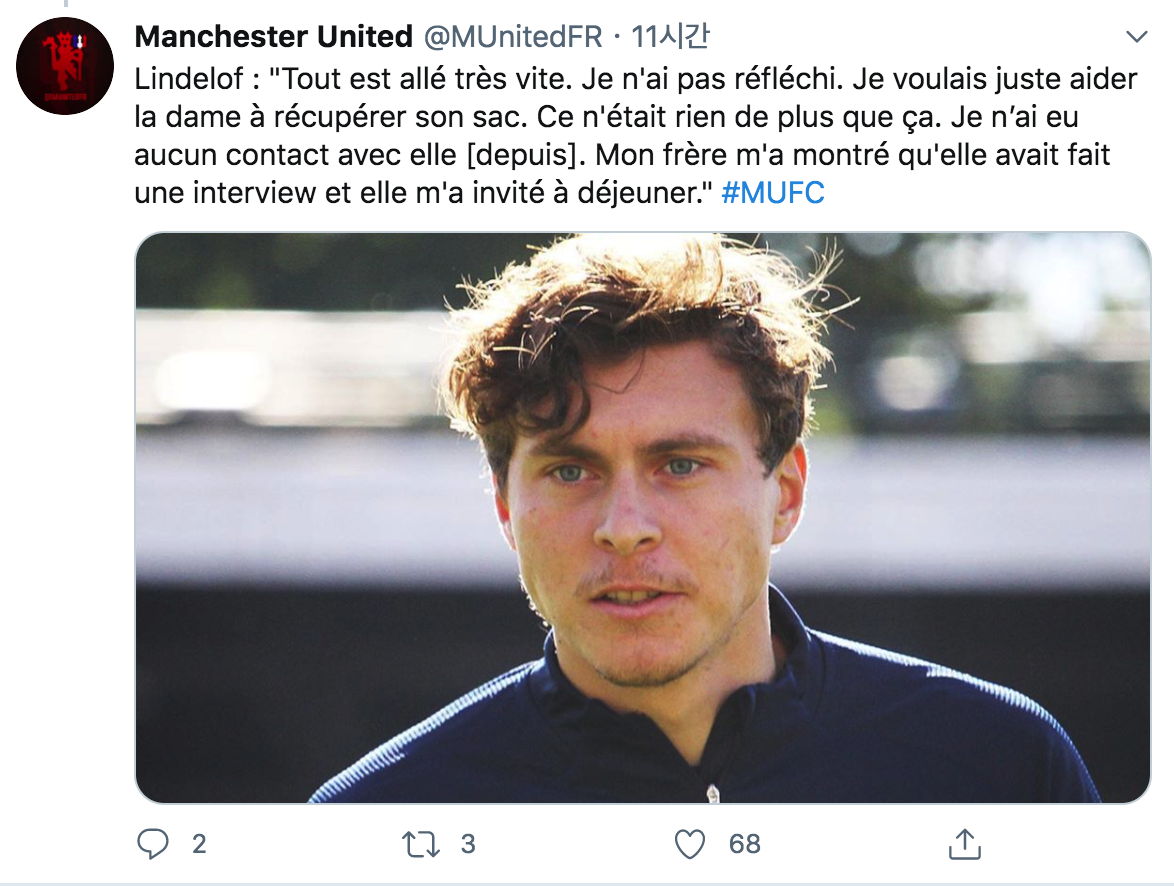 Lindelof : "Tout est allé très vite. Je n'ai pas réfléchi. Je voulais juste aider la dame à récupérer son sac. Ce n'était rien de plus que ça. Je n’ai eu aucun contact avec elle [depuis]. Mon frère m'a montré qu'elle avait fait une interview et elle m'a invité à déjeuner." #MUFC