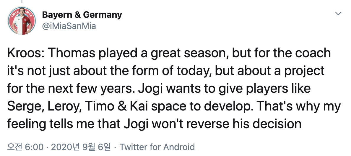 토마스 뮐러는 이번시즌 잘했지만 감독에겐 단지 현재의 폼 문제가 아니다. 앞으로 몇년간의 프로젝트 문제이다. 뢰브는 사네, 나브리, 베르너, 하버츠와 같은 선수들에게 성장할 공간을 주고 싶어한다. 그래서 난 뢰브가 결정을 번복하지 않을거라 생각한다.
