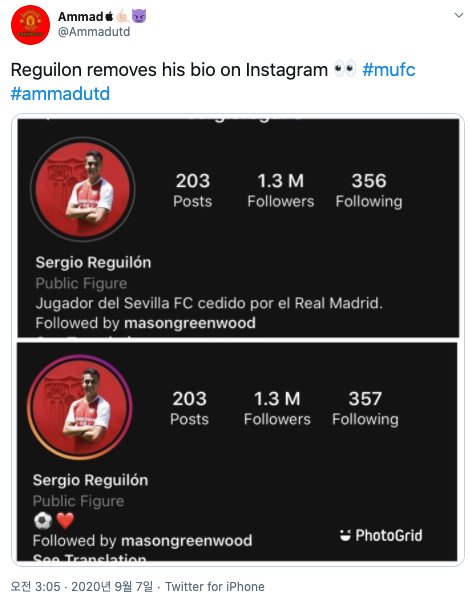 프로필에서 레알 마드리드와 세비야를 지움. 그리고 그린우드는 팔로우 함ㄷㄷ 진짜 맨유로??