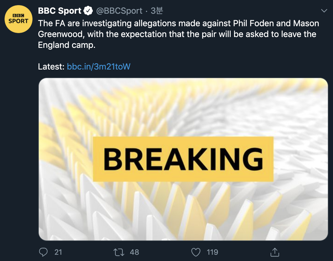 [BBC] FA는 포덴과 그린우드를 상대로 조사중이며 대표팀 캠프를 떠나도록 요청받을것