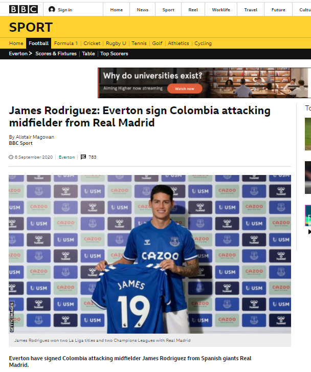 하메스의 에버튼 이적료는 20m으로 보고됐지만 우리 BBC 스포츠는 실제 이적료는 12m으로 보고있다.