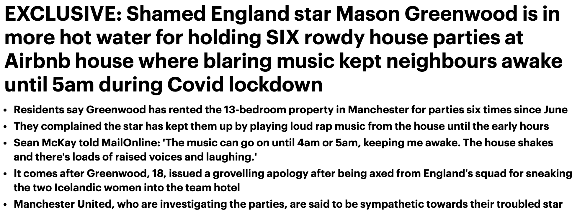 데일리메일의 9일 단독보도에 따르면 그린우드는 지난 6월 이후 6회에 걸쳐 맨체스터의 방이 13개나 되는 대형 렌트 하우스에서 파티를 즐겼다. 렌트 하우스 소유주는 파티에 참석한 이들이 새벽까지 너무 시끄럽게 음악을 틀어놓는 등 소음 공해를 유발해 불만을 드러낸 것으로 알려졌다.