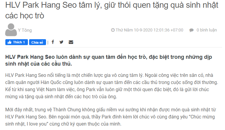 가장 최근에는 응우옌 타인 충이 박항서 감독의 생일선물을 받고 기쁨을 드러냈다. 박항서 감독은 생일선물 외에도 "생일 축하해, 사랑한다"라는 인사를 건넸다.
