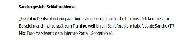 "독일에서 내가 해야 할 일이 몇 가지 있다. 예를 들어, 나는 때때로 수면 문제가 있어서 트레이닝에 늦는다"고 산초는 말했다.