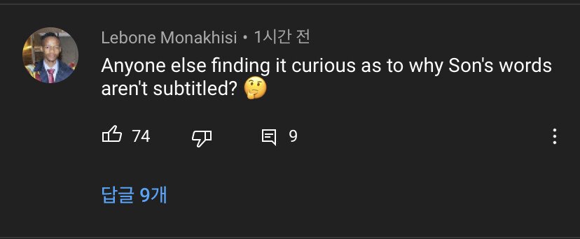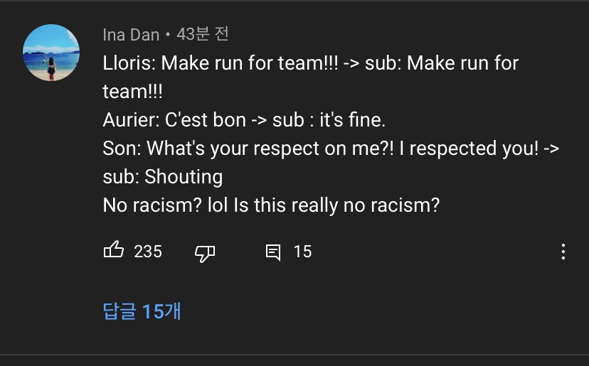 손흥민이 화내는 장면은 자막 없이 전부 shouting으로 퉁침.. 반면 요리스가 한 말은 전부 다 자막으로 번역됨 팀을 위해서 뛰어라 라며 손흥민을 동료들과 팀 스탭 감독 다 있는 앞에서 저격함