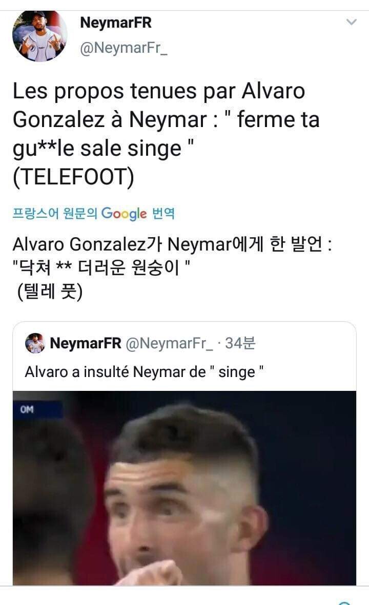 네이마르한테 인종차별하는 마르세유 센터백 알바로