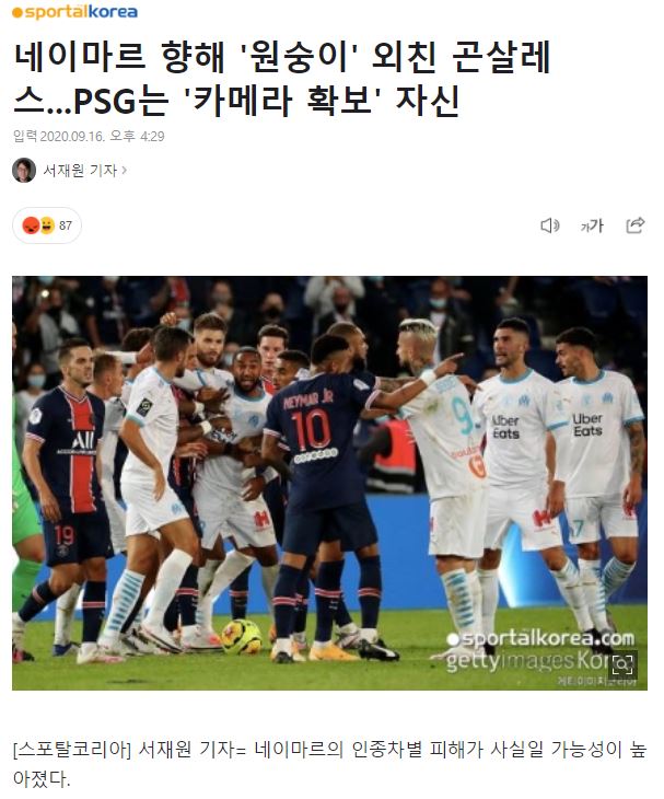 [네이마르 향해 '원숭이' 외친 곤살레스, PSG는 '카메라 확보' 자신]