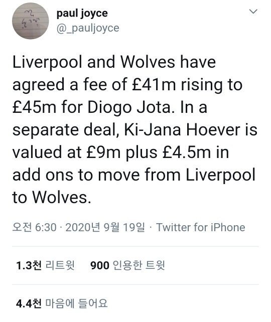 이적료 41m(618억 원)의 초기 이적료가 최대 45m파운드(679억 원)으로 디오고 조타 영입 던딜
