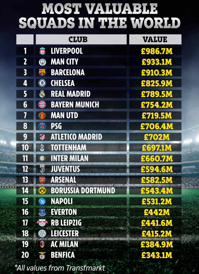 [전세계 축구 팀, 선수 몸값 합산 TOP 20]