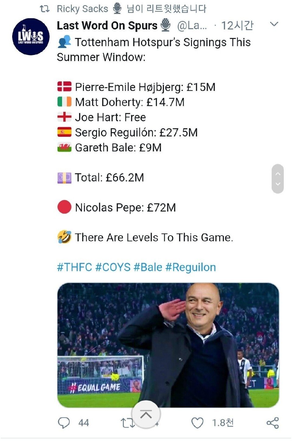 오 알차게 영입한 레비ㅋㅋㅋ 근데.. 토트넘 5명 이적료 < 니콜라스 페페 1명