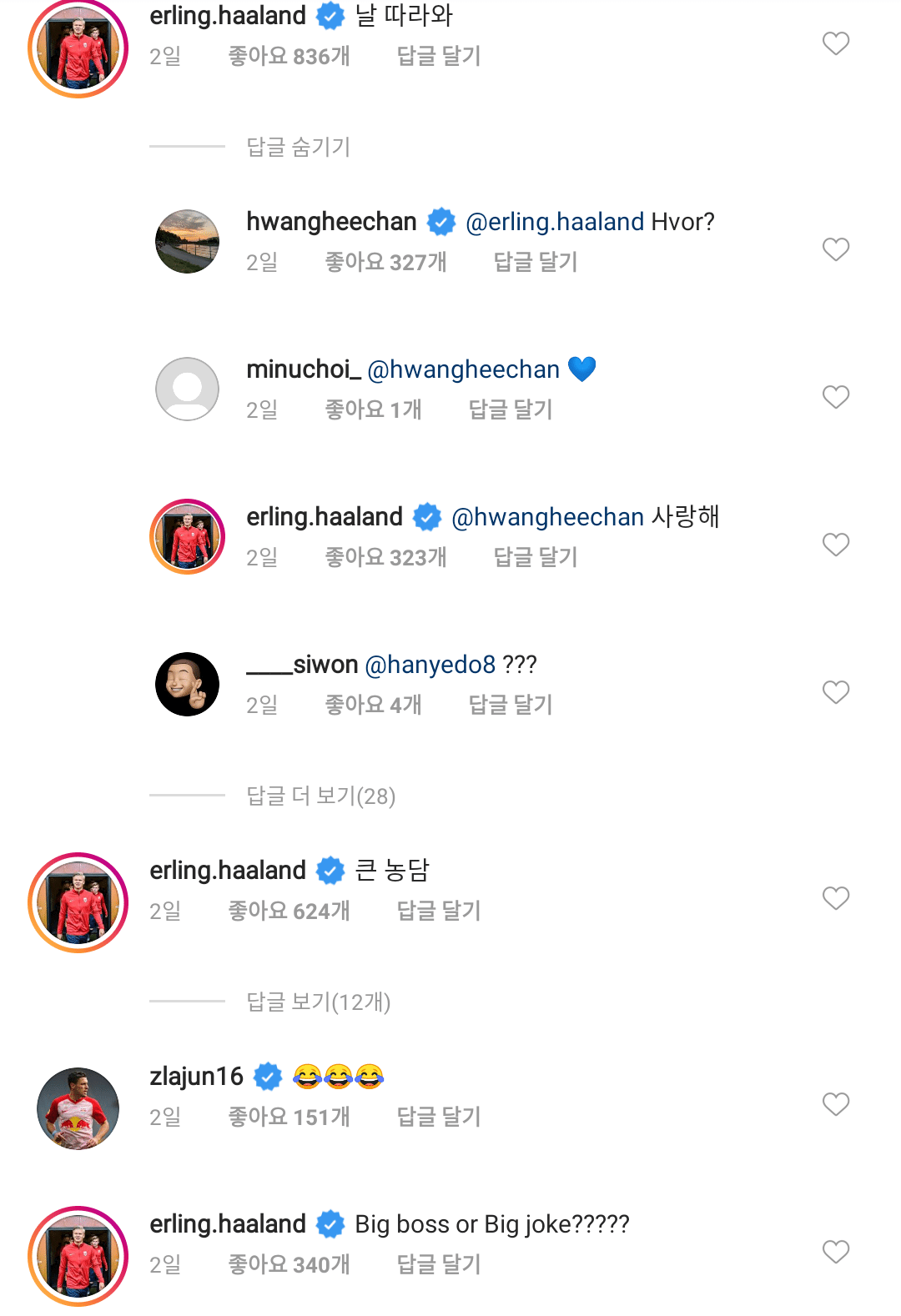 한글 배워서 황희찬한테 댓글 단 홀란드ㅋㅋㅋㅋㅋㅋ 둘 다 잘돼서 빅클럽에서 만났으면 좋겠음ㅋㅋ 그럼 '황홀' 라인??