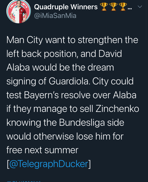 -맨시티는 레프트백 강화를 원함 -다비드 알리비는 과르디올라의 드림 영입이 될 수 있음 -맨시티는 바이언이 내년 여름 그를 자계 잃을 수 있는 것을 알기에 만약 진첸코 판다면 바이언의 결의를 시험해 볼 수 있음