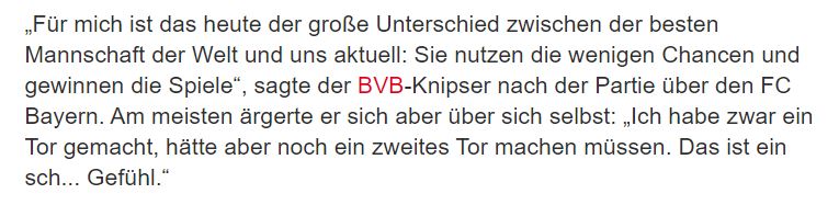 "오늘 경기는 세계 최고의 팀과 우리 팀 사이의 큰 차이점이다. 그들은 몇 가지 기회를 놓치지 않고 게임을 승리했다."라고 홀란드는 FC 바이에른을 상대로 경기를 마친 후 말했다. 그는 무었보다 자신에게 가장 짜증이 났다. "나는 득점을 만들었지만 두 번째 득점도 만들었어야 했다. 그건 정말..좋지 않다.”
