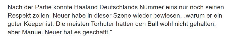 홀란드는 또한 독일 넘버1 키퍼에게 경의를 표했다. 그는 "왜 그가 좋은 키퍼인가? 라는 것을 증명했다. 대부분의 골키퍼들은 공을 막지 못했을 것이지만 마누엘 노이어는 그것을 했다"