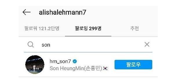 알리샤 레만 팔로우 검색하면 손흥민 나옴. 와.. 우리 흥..ㄷㄷ