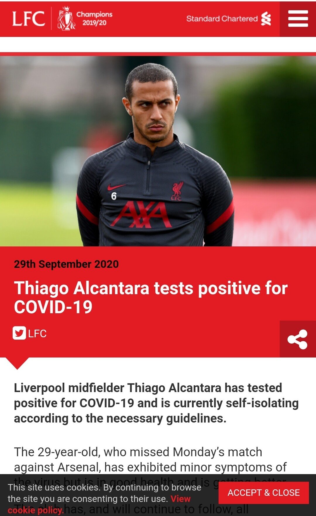 공홈 기사: https://www.liverpoolfc.com/news/first-team/410566-thiago-alcantara-tests-positive-for-covid-19 |