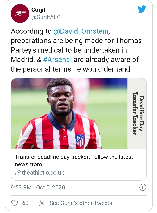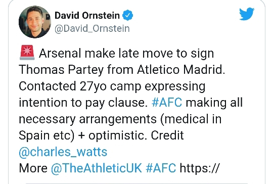 [[속보]아스널, 라리가사무국에 토마스 파티 바이아웃 지불의사 전달]