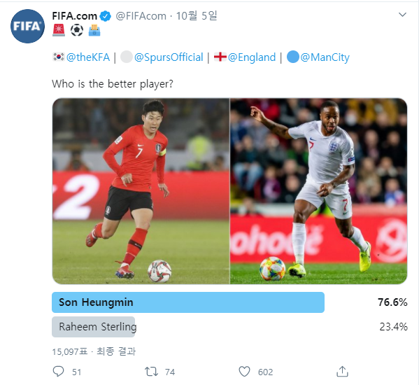 [FIFA 공식 SNS에서 실시한 '손흥민VS스털링' 투표 결과ㄷㄷㄷ]
