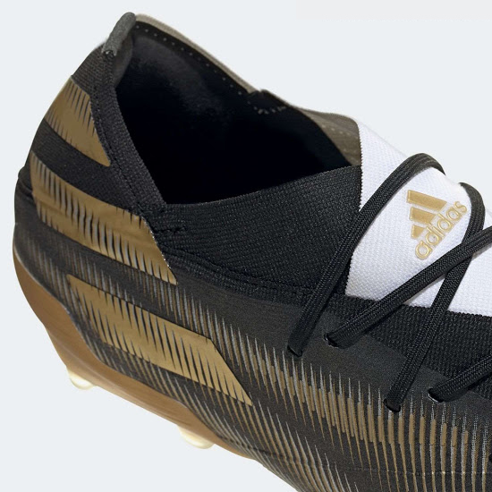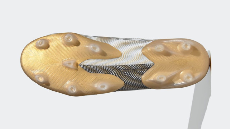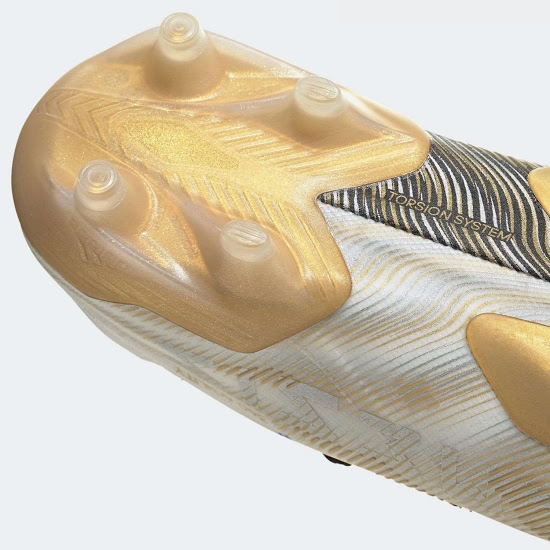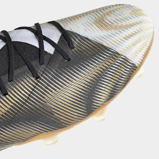 축구화의 색상은 black / white / gold / silver 로 이루어져있습니다. 아웃사이드 부분은 블랙, 인사이드와 토박스 부분은 화이트로 분할 된 색상의 디자인을 볼 수 있고, 반짝이는 금색으로 이루어진 파형 모양의 그래픽과 로고가 적용되어 있습니다.