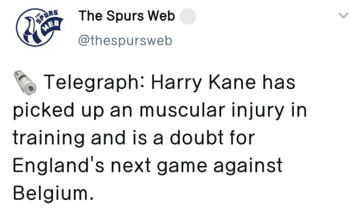 Telegraph: Harry Kane has picked up an muscular injury in training and is a doubt for England's next game against Belgium.