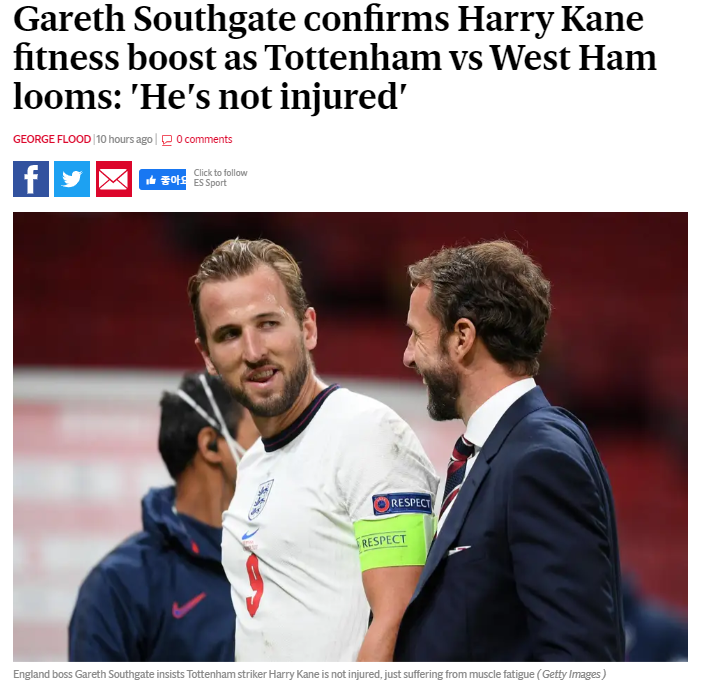 잉글랜드 국가대표팀 감독인 사우스게이트가 해리 케인의 부상 관련 우려를 없애는 발언을 하자, 토트넘 팬들은 안도의 한숨을 내쉬었다.