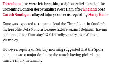 일요일 아침의 보도에 따르면 케인은 훈련 중에 근육 부상을 입었고 벨기에전 출전에 의심이 간다는 소식이 있었다. 따라서 케인이 18일 라이벌 웨스트햄과의 경기를 놓칠 수 있다는 우려가 불가피하게 제기되었다.