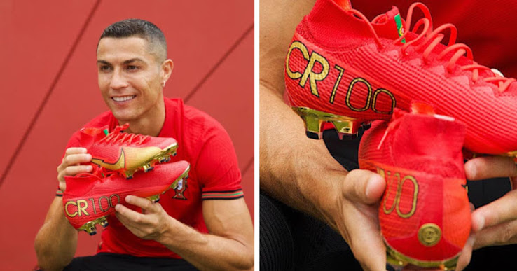 축구화에는 포르투갈 국기를 표현하는 것들과 CR7 문구 대신 'CR100' 문구가 새겨진 것이 특징입니다.