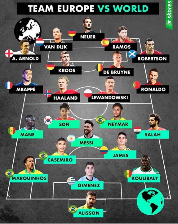 메시-네이마르-손흥민 삼각편대라니ㄷㄷ 스코어스가 선정한 세계 올스타 팀. 두 팀이 붙으면 누가 이길까요?