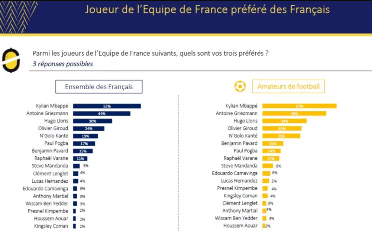 '프랑스인들이 가장 좋아하는 국가대표 축구선수'에서 일반 대중, 축구팬 모두 1위 킬리안 음바페