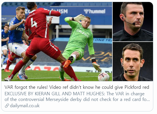 머지사이드 더비의 VAR심판이었던 데이비드 쿠트는 픽포드의 끔찍한 태클에 퇴장을 줄수있다는 규칙을 까먹음