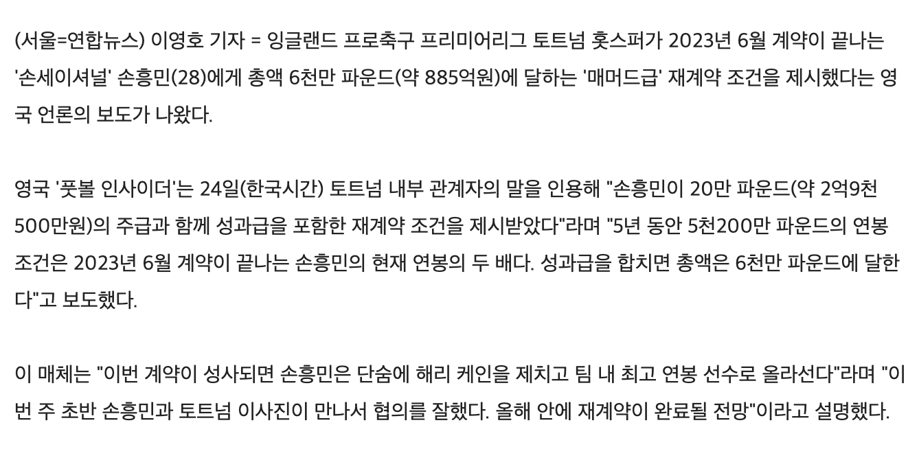 | 토트넘, 손흥민에 5년간 총액 6천만 파운드 재계약 제시 | |