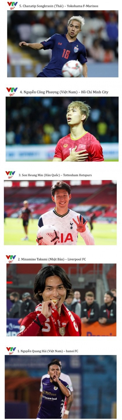 5위 - 차나팁 송크라신 (태국) 4위 - 응우옌 꽁푸엉 (베트남) 3위 - 손흥민 (대한민국) 2위 - 미나미노 타쿠미 (일본) 1위 - 응우옌 꽝하이 (베트남)