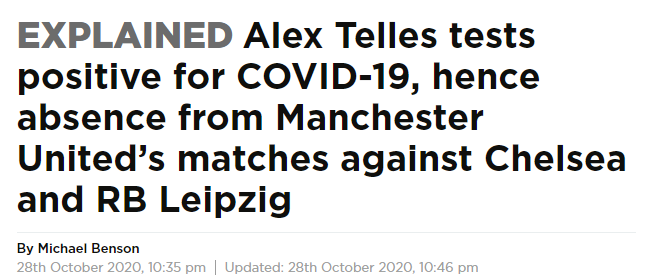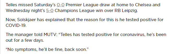 솔샤르는 MUTV와의 인터뷰에서 "텔레스는 코로나바이러스 양성반응을 보여 며칠간 외출하지 않았다"고 말했다.