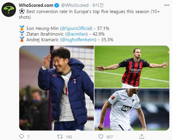 2위는 불혹에 가까운 나이에도 세리에A 득점 선두에 오른 즐라탄 이브라히모비치다. 즐라탄의 기록은 42.9%였다. 35.3%로 3위에 오른 선수는 호펜하임에서 분데스리가 득점 2위에 오른 안드레이 크라마리치였다. 두 선수의 기록도 대단하지만 57.1%를 기록한 손흥민과는 현격한 차이가 났다.
