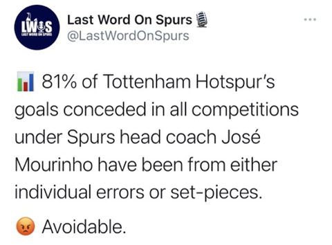 무리뉴 체제의 토트넘. 실점 원인의 81%는 개인의 실수와 세트피스ㄷㄷ (센터백들의 실수가 많긴 많았죠..)