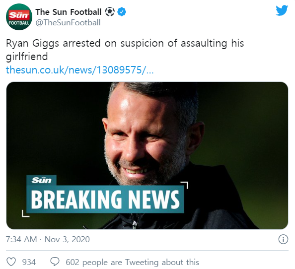 출처 : 더선https://www.thesun.co.uk/news/13089575/ryan-giggs-arrested-bust-up-girlfriend/?utm_medium=Social&utm_campaign=sunfootballtwitter&utm_source=Twitter#Echobox=1604356476