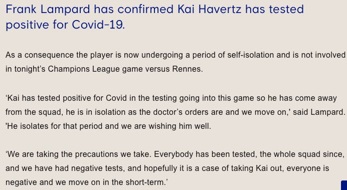램파드 감독은 하베르츠가 코로나 19 양성 반응을 보였다고 발표. 하베르츠는 현재 자가 격리 중입니다.