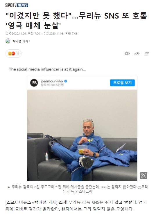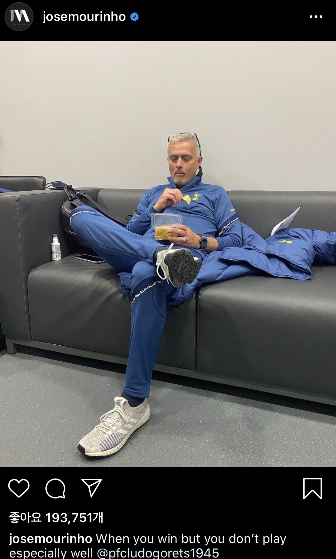 무리뉴 감독도 마찬가지였던 모양이다. 경기 뒤에 개인 채널에서 "이겼지만 특별하게 잘 하지도 않았다"고 말했다. 무리뉴 감독은 토트넘 감독 부임 뒤에 활발한 SNS 활동으로 팬들과 소통하고 있다.