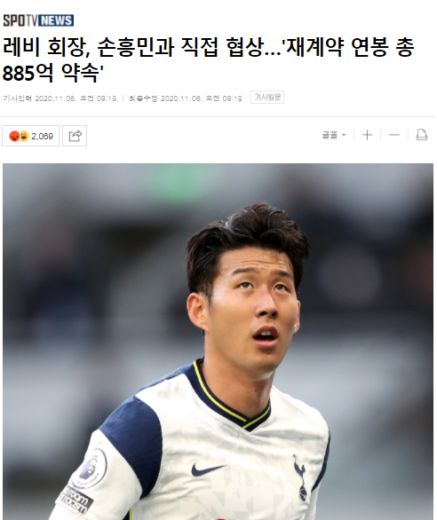 ...................현지 보도에 따르면, 팀 내 주급 20만 파운드(약 2억 9500만 원), 옵션 포함 총액 연봉 6천만 파운드(약 885억 원) 재계약을 제안했다. 토트넘 내에서 '매머드급'이라는 표현도 있었다. 손흥민과 재계약은 12월 안에 체결하는 것이 목표다......................