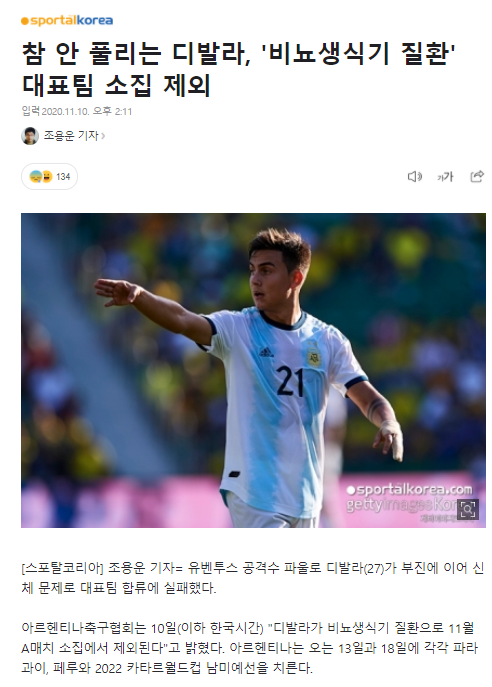 | 디발라, '비뇨생식기 질환'으로 대표팀 소집 제외 | |