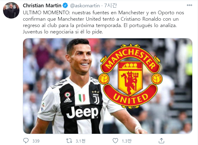 맨체스터와 포르투갈의 소식통은 맨유가 크리스티아누 호날두를 다음 시즌 맨유로 복귀하도록 제안을 한 것을 확인하였습니다. 유벤투스는 협상 할 의향이 있습니다.