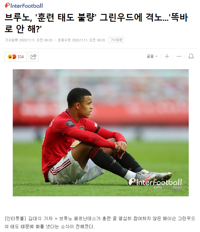 영국 '미러'는 10일(한국시간) 영국 '타임즈'의 보도를 인용해 "브루노는 그린우드가 훈련에서 보여준 부족한 모습에 격노했다. 그린우드는 지난 금요일 훈련에서 패스를 거부하여 브루노를 화나게 만들었다. 두 선수 사이에서 언쟁은 일어나지 않았지만 그린우드에 대한 걱정은 점점 커지고 있다"고 보도했다.