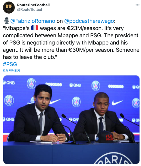 파브리지오 로마노 : 음바페의 연봉은 €23m이다. 음바페와 PSG의 사이는 매우 복잡한 상태.. 현재 음바페의 에이전트와 협상 중이며 연봉 €30m 이상이 되어야 할 것. 그게 아니라면 누군가는 클럽을 떠나야 함