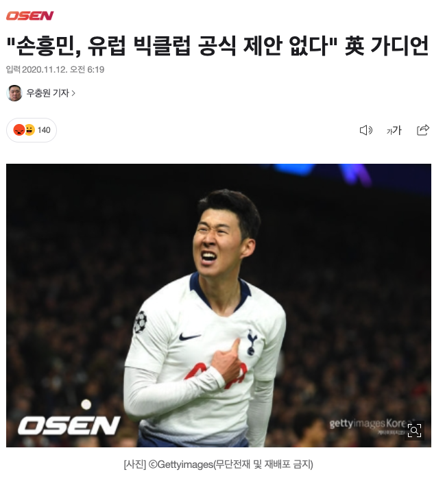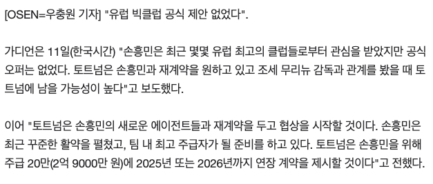 | [가디언] 손흥민을 향한 '빅클럽'의 공식 제안 없다 | |